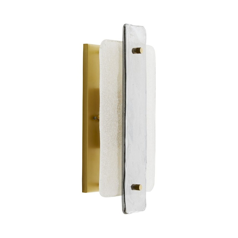 Thick seedy glass with smoke luster finish creates a refined organic showpiece. Mixed materials form a rectangular design that elevates wall spaces. Damp-rated, though outdoor use may affect the variable gold finish.
