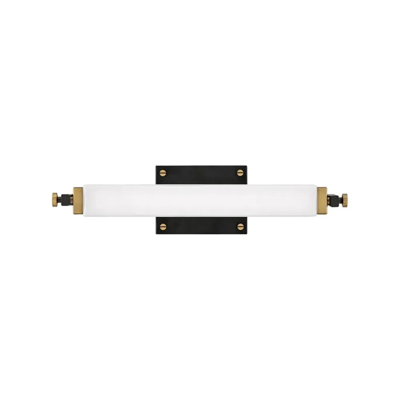 Rollins is both industrial in form and transitional in style. Unique rectangular etched opal glass has softly rounded edges that is offset by contrasting details on the back plate and the knobs anchoring either end. This integrated LED design comes in two finish combinations, Black with Chrome, and Black with Heritage Brass, and can be hung both vertically and horizontally.