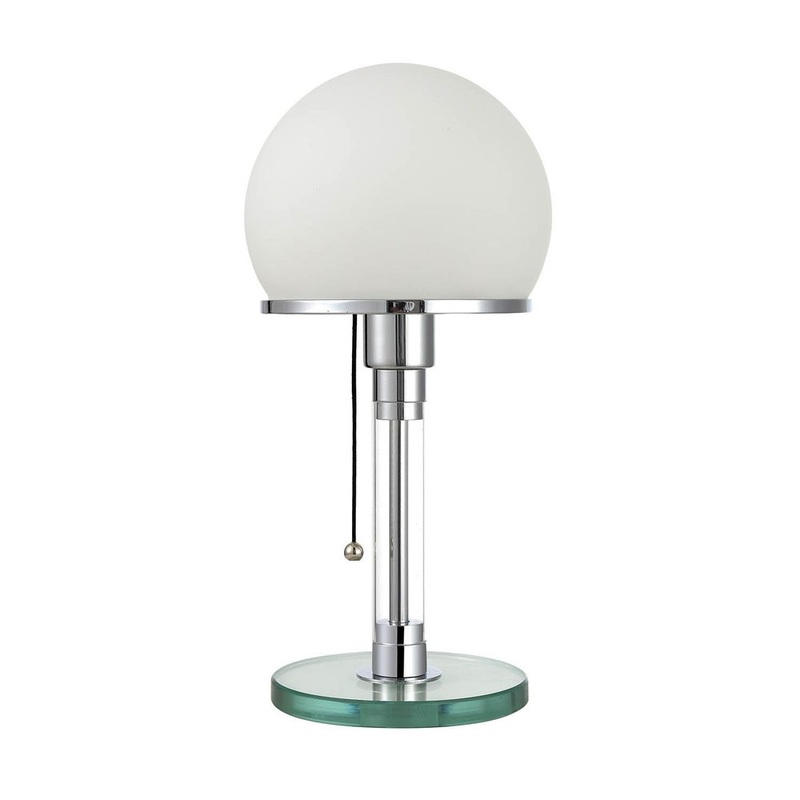 Inspired by the original 1924 design by Wilhelm Wagenfeld and Carl Jakob Jucker this icon of Bauhaus design is the ideal accent for your modern living or work space. Embodying the idea of “form follows function” this piece features simple geometric shapes – a circular base, a cylindrical shaft, and aspherical shade. Crafted from glass and steel the lamp’s working parts are visible while the opaque glass shade helps to diffuse the light. A standard 60 watt bulb under the shade provides ambient lighting for your room.
