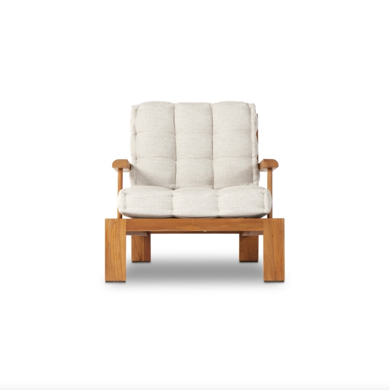 Cushy comfort, made for the outdoors. Wide framing of FSC-certified teak features paddle legs and a slatted back, with dramatically tufted sand-colored cushioning for a relaxed sit. Cover or store indoors during inclement weather and when not in use.