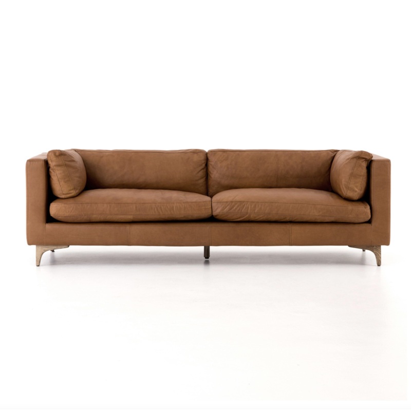 Mid-century modern undergoes a trend-forward refresh. Top-grain leather takes on a camel hue for a soft, buttery sit. Legs of weathered oak stay stout, allowing leather to stand front-and-center.