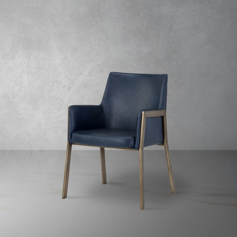 This dining armchair features a shapely design with an exposed brushed antique brass frame. Available in bravo admiral, black, cognac and kendall grey faux leather. Handle With Care: This design has been crafted with faux leather. Faux leather is manufactured to reflect the natural characteristics of leather; as such, colour variations, markings wrinkles, grooves, and light scratches are appreciated characteristics. No two pieces will be alike. Visit our Product Care page for more information on how to ensure the lasting beauty of this piece.