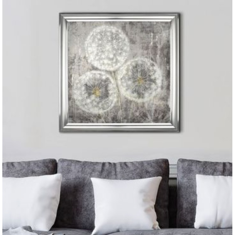 Carol Kavanagh’s Bewitch captures the magic and mystery of the dandelion clock, in all its delicate, breathless beauty. Overlaying a sumptuous background pattern, the image is printed on metallic canvas, creating intense shards of pure silver scintillating on those filigree seed tips. Demurely glamorous in a slick, contemporary square silver frame.