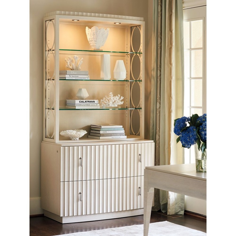 Marketing Copy: Inspired by the timeless elegance of Hollywood Regency and Art Deco styling, designs in Cascades feature scalloped detailing that accentuates the graceful lines and curved fronts that define the distinctive look. Crafted from white oak veneers, pieces are lightly wire-brushed and finished in a fresh linen-white coloration with custom hardware and finials in brushed nickel.The portfolio of designs includes desks, files chests and bookcases for the home office, media consoles in two sizes, and a game table with stationary and castered chairs. As a leader in award-winning design for over 130 years, Sligh offers a sophisticated and stylish approach to some of the most important rooms in the home. We believe in showcasing great design, while incorporating function that appears effortless.