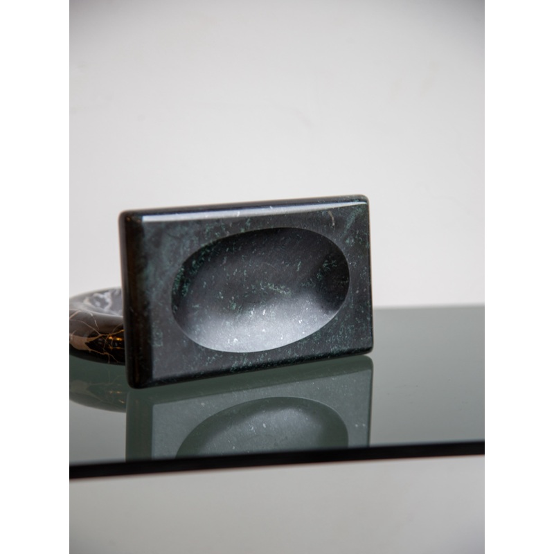 A sculptural Italian marble soap tray from the 1970s, elegantly carved with a minimalist sensibility. The rectangular form is softened by gently rounded corners and a shallow concave center, perfectly designed to cradle a bar of soap. Crafted from black marble with natural veining in warm beige and subtle grey, each piece is unique and timeless.
