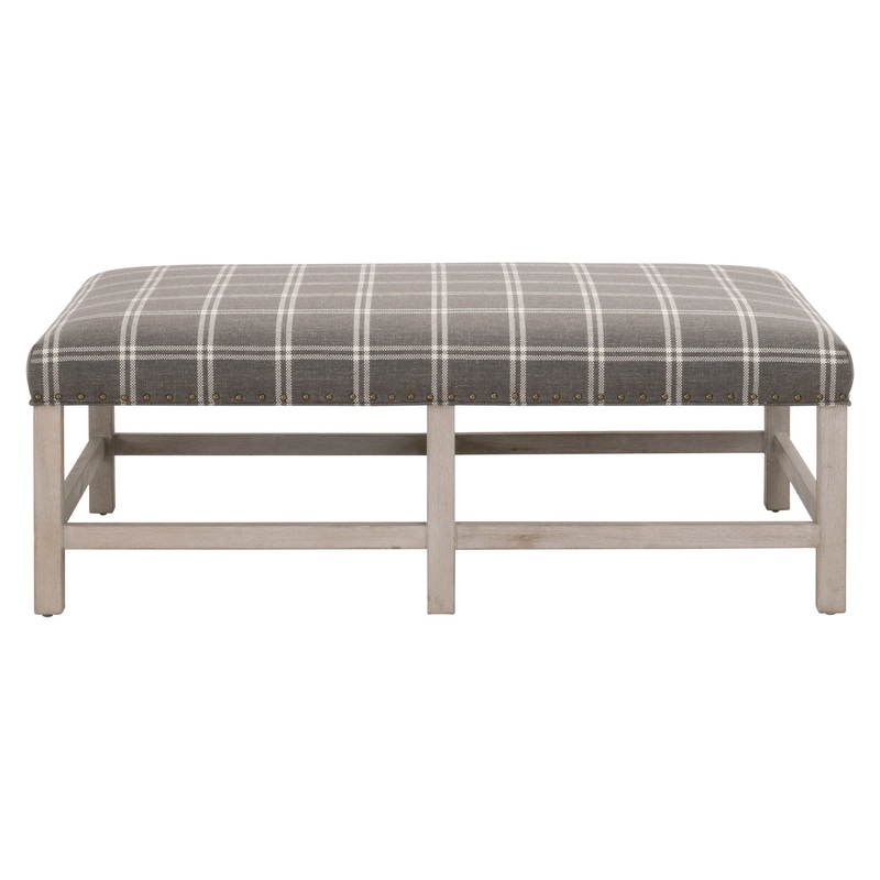 Complete your living room with this bold and beautiful upholstered coffee table. This transitional coffee table will fit in well with many rooms and furniture designs. It is upholstered with a unique smoke gray and white plaid material. This material is a performance fabric, making cleaning easier. The bottom of the upholstered top is accented with gold nail head trim, which softly adds an element of farmhouse charm. This wide and deep coffee table will be the perfect accent piece to other furniture pieces. With its ample surface space, the table will accommodate dcor, books, and other items you wish to fill your space with. It is constructed with a sold birch wood base with a natural gray finish.