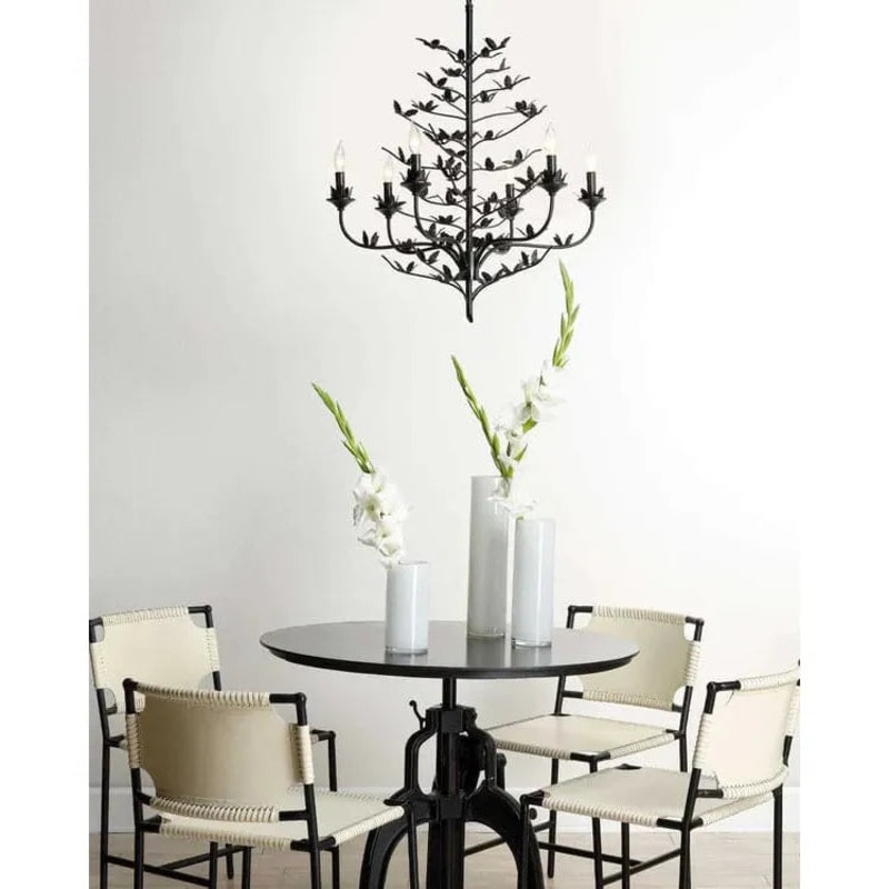 The structure of this chandelier was inspired by the natural beauty of foliage in bloom. Every branch of the black iron chandelier has its own blooming petals, each crafted and attached by hand. Six iron arms hold faux dripping candlesticks blooming out of delicate iron petals. This eye-catching piece of art is expertly handcrafted and will add dramatic flair to your home’s decor. The fixture is suspended from a coordinating 8-foot chain in black iron, and professional installation is recommended.