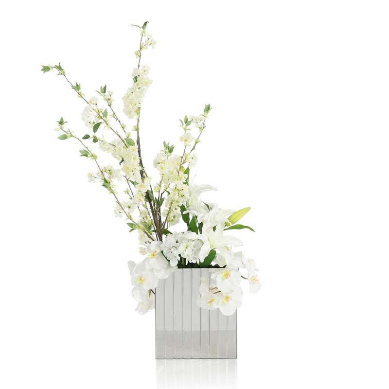 Blooming Dawnis an asymmetrical arrangement showcasing white cherry blossom branches, real touch white phalaenopsis orchids, casa blanca lilies and hydrangeas in an elegant tall rectangular ribbed mirror vase.