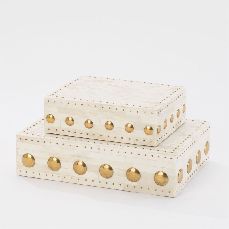 Description: The Stud Collection of boxes and a coordinating tray are meticulously crafted of natural bone with brass accents. Small and large studs encircle the perimeter, creating a harmonious rhythm. Casual yet elegant, these are useful and decorative. Use individually or as a set. Each sold separately.