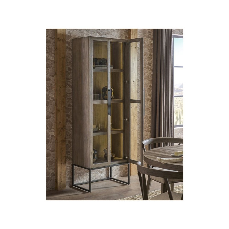 The Boulder Display Cabinet combines modern lines with functional elegance. Finished in a warm Boulder medium-brown, its glass doors and adjustable wood shelves offer a stylish way to showcase your favorite items. The sleek metal base adds an industrial touch, creating a versatile piece that complements any living or dining space with its blend of open and closed storage.