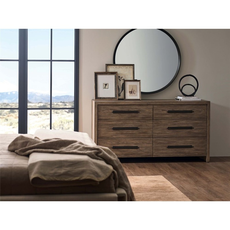 Crafted in a warm Boulder medium-brown finish, the Six Drawer Dresser blends natural texture with clean, modern lines. Its framed drawer fronts and sleek hardware create a sophisticated storage solution, perfect for adding both functionality and a touch of architectural detail to your bedroom.