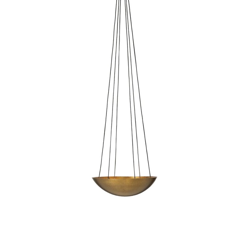 A wide, shallow bowl in aged brass with six sockets, diffusing light upward for an ambient glow. Suspended by six sleek cords, its streamlined design eschews traditional tension wires for a clean silhouette.