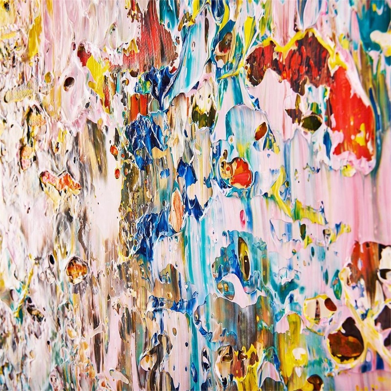 Bright Reverieby artist LM Zhou is a vivid work of art in acrylic paint on canvas. The piece showcases a stunning cascade of intermingling color from top to bottom, featuring textural peaks and valleys that infuse the artwork with a sense of dimension. This painting is held within a black aluminum gallery frame and may only be displayed from a vertical orientation.