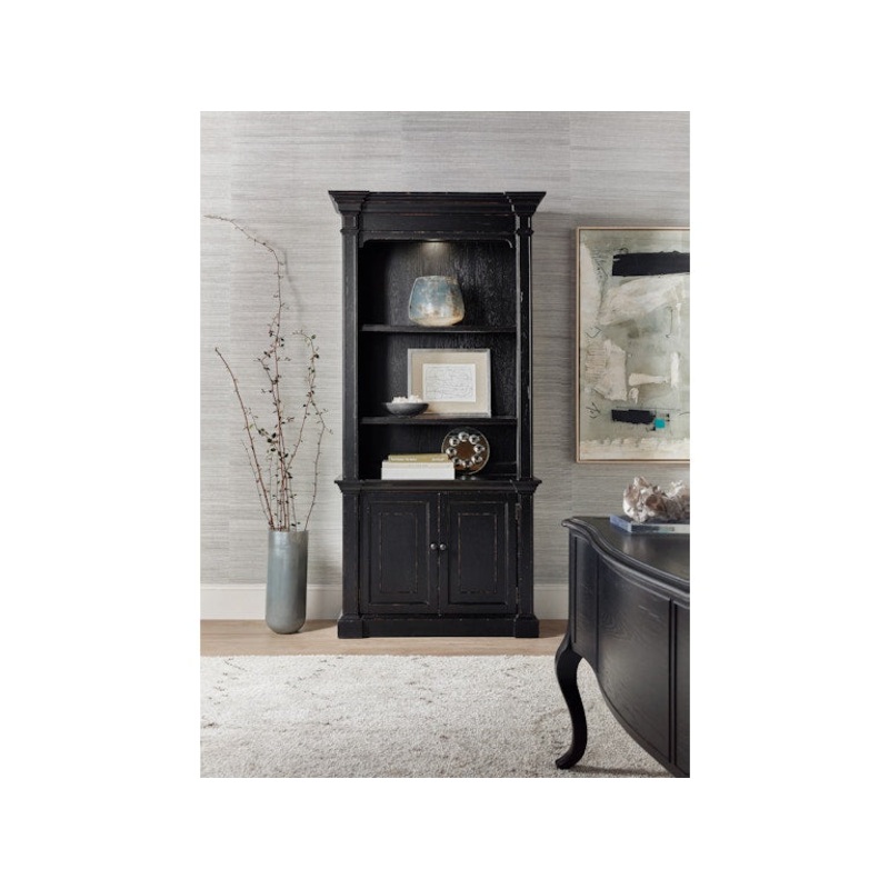 Casual yet refined and stylish, the Bristowe Bookcase sets a professional and inviting tone for any work-from-home or living space. Crafted of Pecan Veneers in a Tuxedo black paint finish with touches of warm brown, the bookcase has two doors with one adjustable shelf behind and 3 adjustable wood shelves. Special features include anti-tip hardware and a puck light at the top with a touch-switch on the right pilaster. The Work Your Way program focuses on the new reality many consumers face as they continue to do much of their work from their homes. Available in five design styles, the program offers an assortment of key home office pieces for a variety of spaces whether a dedicated executive home office or a more casual workstation. Ranging in scale and functionality, all of the groups within Work Your Way include an executive desk, a junior executive desk, a writing table, a lateral file, a credenza and hutch and a bookcase.