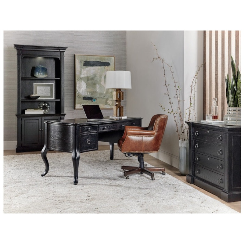 Casual yet refined and stylish, the Bristowe Executive Desk sets a professional and inviting tone for any work-from-home space. The dramatic desk silhouette is crafted of Pecan Veneers in a Tuxedo black paint finish with touches of warm brown, and is accentuated by oil-rubbed bronze-finished rings and pull hardware and boldly-shaped cabriole legs. The desk offers 4 drawers, with the left drawer a file drawer with pendaflex system and full extension metal ball bearing slides and the top right drawer featuring a removable pencil tray, inserts and removable writing slide with full extension metal ball bearing slides. The center drawer has a drop-front for keyboard use and a wire cutout in the back of the drawer. The right bottom drawer has a false bottom with finger hold for hidden storage and is on full extension metal ball bearing slides. The desk is finished on all sides so it can float in a room. The Work Your Way program focuses on the new reality many consumers face as they continue to do much of their work from their homes. Available in five design styles, the program offers an assortment of key home office pieces for a variety of spaces whether a dedicated executive home office or a more casual workstation. Ranging in scale and functionality, all of the groups within Work Your Way include an executive desk, a junior executive desk, a writing table, a lateral file, a credenza and hutch and a bookcase.