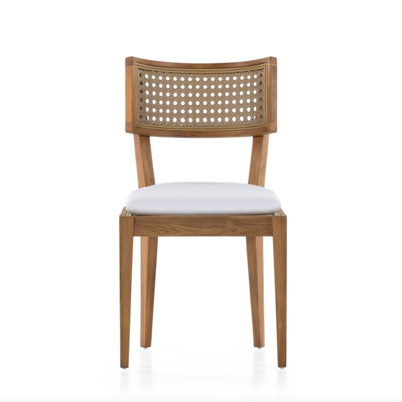 Mixed materials refresh retro dining style. Natural FSC-certified teak frames a textural inlay of faux rattan. Removable cushion is covered in 100% Olefin, known for its UV-resistant, water-repellent, quick-drying abilities. Cover or store inside during inclement weather and when not in use.