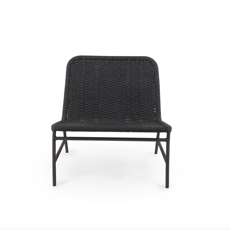 A simple, textural take on outdoor-friendly seating. Black-finished aluminum armless framing welcomes dark grey rope, for a sleek look with underlying depth. Cover or store indoors during inclement weather and when not in use.