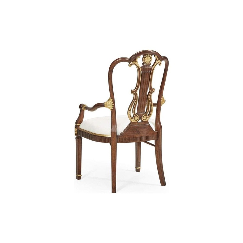 Neo-classical Adam style mahogany arm chair with profuse carving to the curved lyre splat back highlighted with gilded details, repeated on the arms which are specially designed to sit under the dining table. Serpentine front rail with gilded paterae and tapering square cross section front legs. Upholstered seat in lining and foam only.