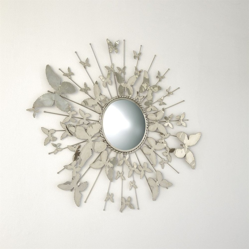 Description: The butterfly is seen as a symbol of change, hope, life, and endurance around the world. Bring these wonderful attributes into your space with our Butterfly Mirror. A nickel plated brass frame featuring stunning butterfly details supports a round mirror.
