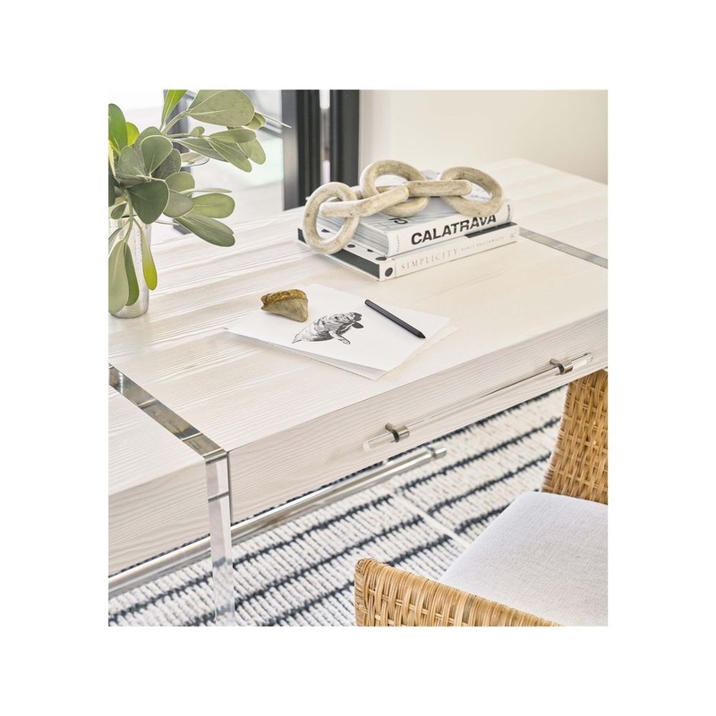 Watch as the Cabo Writing Desk seamlessly brightens up any home office with its white sand finish, accentuated by acrylic legs and silver hardware.