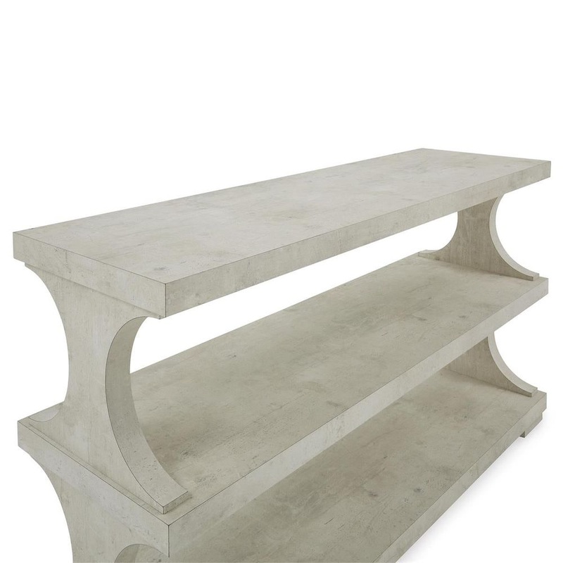 The Rhythm Console Table exhibits a sophisticated, refined look that imbues an interior space with a dignified aura. Crafted from beech wood, the piece features a tiza gesso finish for a gorgeous textural look. Three tiers of open-air shelving are separated by curvaceous supports, creating playful juxtaposition between straight lines and rounded angles. The piece features lights within the interior shelves, providing subtle illumination.