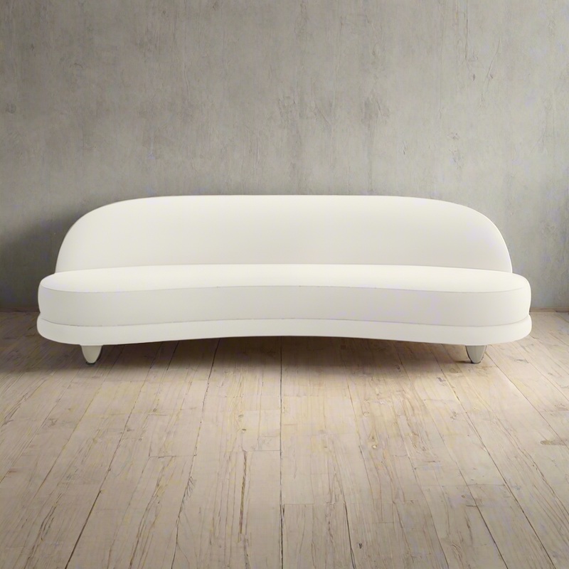 With a sleek, serpentine shape, this modern sofa introduces a fluid, biomorphic form to living interiors. Dressed in a tactile, two-tone boucle, its curvaceous silhouette invites conversation and luxe comfort. Softly rounded wood feet in a sand-colored finish add to its organic yet elegant style aesthetic. 90-inch Tulum sofa also available.