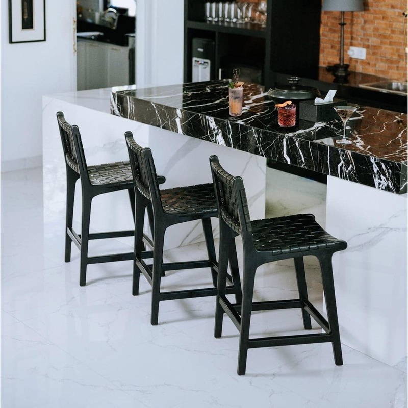 This handsome stool is the perfect addition to modern and contemporary style spaces alike. A sturdy teak frame provides ample support for the woven leather strap seat and back. The simple design allows the texture of the weaving to shine through. Available in brown or black.
