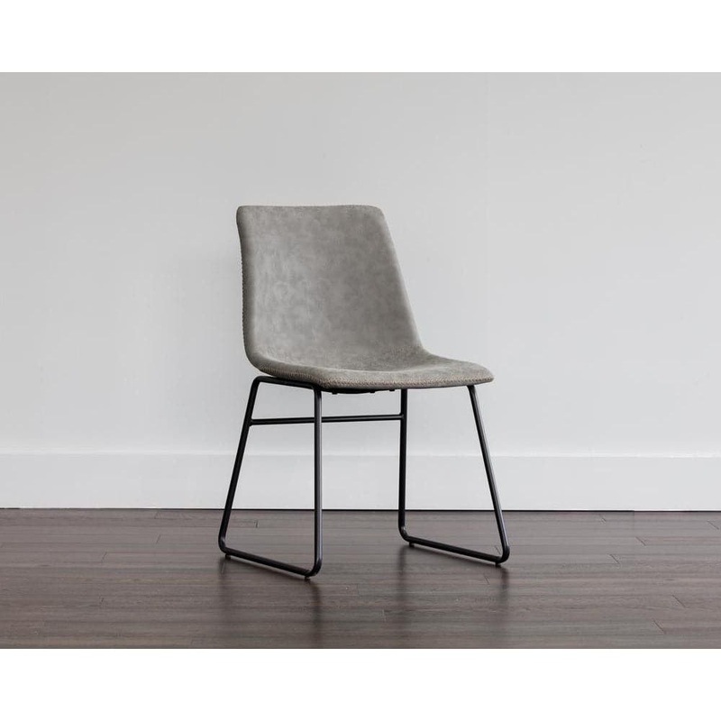 A comfortable and compact dining chair. Features a simple, mid-century silhouette and finished with a brushed black steel frame. Stocked in antique black faux leather. Handle With Care: This design has been crafted with faux leather. Faux leather is manufactured to reflect the natural characteristics of leather; as such, colour variations, markings wrinkles, grooves, and light scratches are appreciated characteristics. No two pieces will be alike. Visit our Product Care page for more information on how to ensure the lasting beauty of this piece.