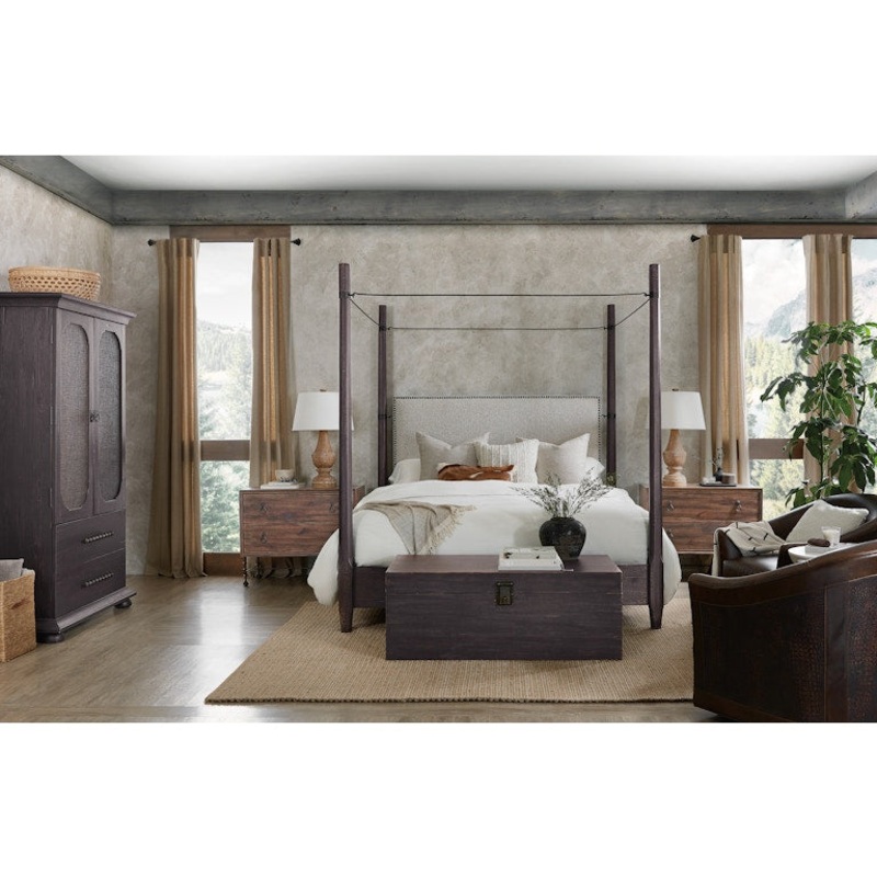 Its the bed that dreams are made of. The Big Sky Corbel Poster Bed is finished in the dramatic Charred Timber with a suspended linen upholstered headboard surrounded by decorative nail heads and an oxidized brushed bronze metal canopy. The Charred Timber finish contrasts with the Saxony Porcelain performance fabric on the headboard. Includes headboard, footboard and rails. The natural beauty and near mystical experience of the American wilderness inspires a spirited collection from Hooker Furniture, a celebration of dramatic vistas and the freedom to roam, a land of rough-hewn timber and towering snow-capped peaks, boundless plains, and cool, clear mountain lakes. Hooker brings home a dream of wide-open spaces and a life lived in tandem with iconic landscapes with furnishings that evoke the weight, heft and heritage of post and beam construction, the mark and artistry of true craftspeople, and substantive, thoughtful designs right for today. Watch for warm, rustic, hickory veneer, and rich finishes like charred timber, dusk, and avalanche, organic textures like burlap and top grain leather, forged hardware, and classic moldings for the traditionalist. Those with a more modern bent will gravitate toward the clean lines of waterfall edges, crosshatch surfaces and planking details that speak to authenticity and the hand of the maker. Welcome to the peaceful, easy feeling of Big Sky. Its time to simply breathe.