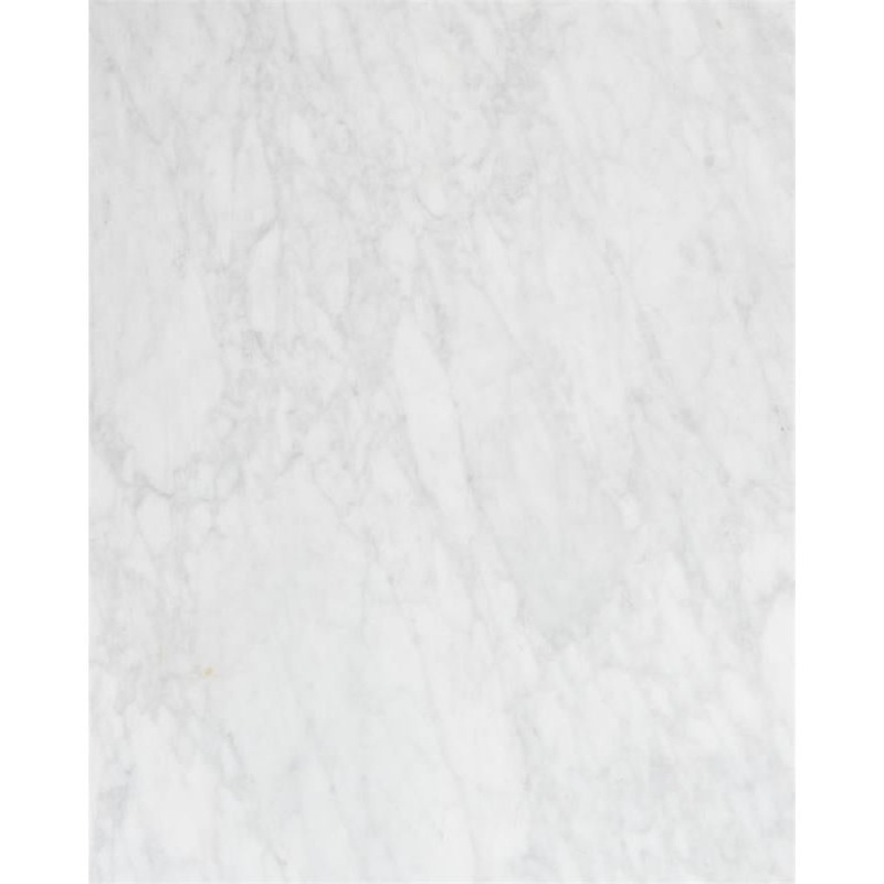 The Carrara marble top of this cocktail table is supported by a steel base finished in gold. The base features double legs strapped together with ties, which are repeated underneath the top.