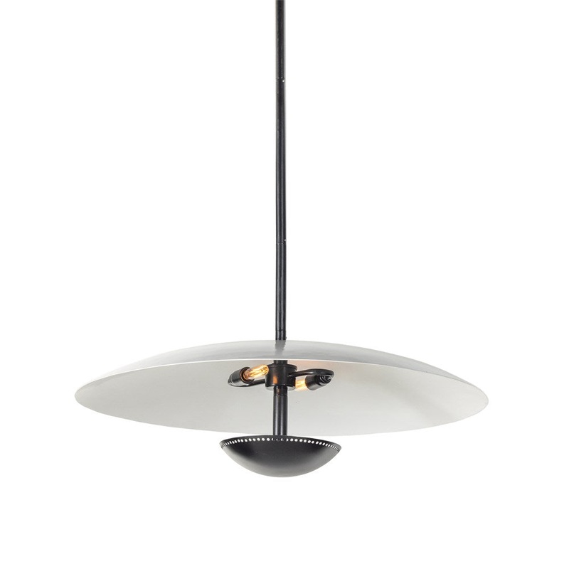 A mixed material match. A large-scale shade finished in high-enamel black gloss tops an antique brass plate with a trend-forward perforated edge to softly diffuse light.
