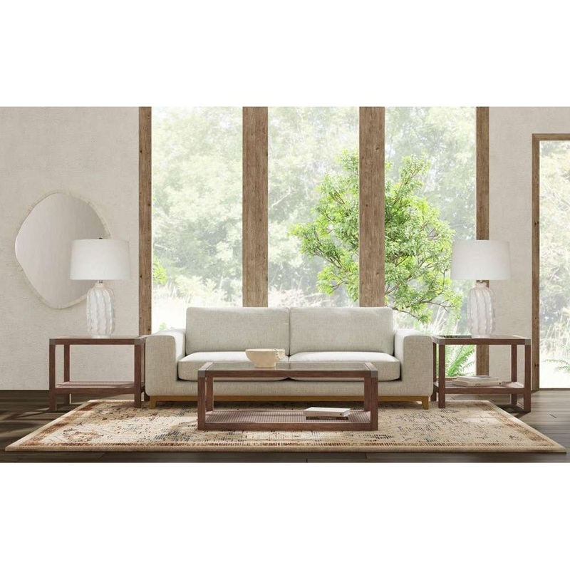 Step into coastal farmhouse charm with the captivating Calumn Cocktail Table. Crafted from solid wood, wire-brushed for rustic allure, it brings nature indoors with a clear, tempered glass top and an open cane-detailed lower shelf. Features casters on the legs to easily maneuver to accomadate your spacing needs. The neutral driftwood finish, complemented by brushed nickel corner caps, adds elegance and warmth to your space. Designed for enduring style and functionality, this cocktail table becomes a focal point in your home .