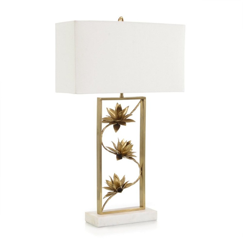 Description: A stunning marriage of natural inspiration and modern design, the Camden Table Lamp features a polished brass body with three gorgeous flowers suspended in the center. The flowers, also in polished brass, ride along a curvaceous stem that lends a wealth of motion and depth to the piece. The lamp gently rests upon a rectangular base of white marble, while brass hardware and a matching finial complete the look.