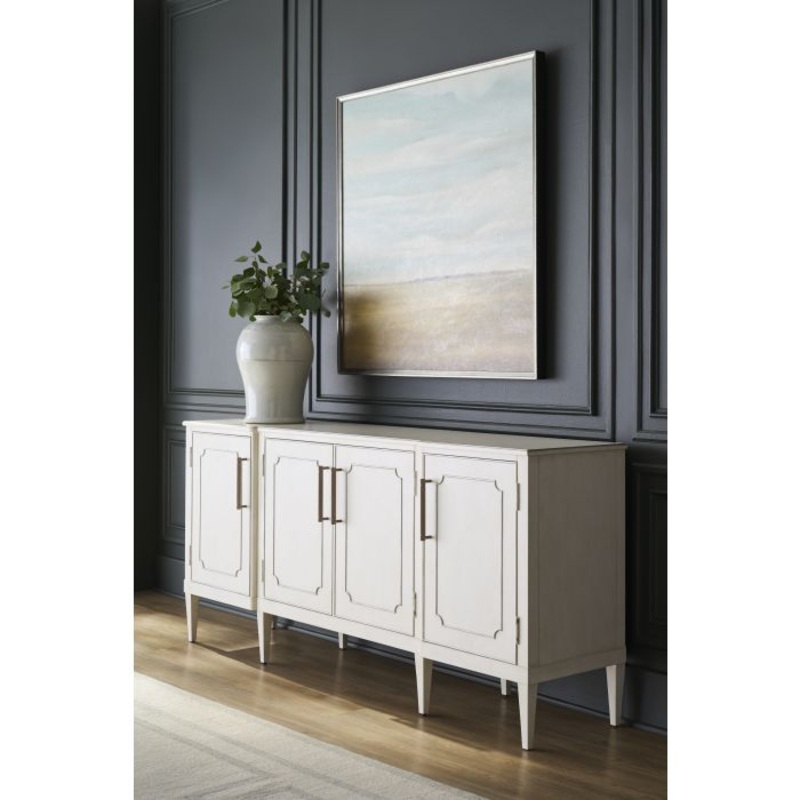 Taking a modern approach to traditional design elements, our Camille Dining Collection includes a dining table, credenza and bar cabinet. Crafted from rubberwood solids and finished in Linen with a contrast highlight stripe in Antique Pewter. Camille features many guest and storage-friendly solutions, including: a dining table extends from 77″ to 121″ wide, a marble-topped bar cabinet with one interior drawer and reversible shelf with wine storage, and a credenza with four drawers, one center drawer and adjustable shelves. Camille is stocked Linen or available in 40+ additional custom finishes via our Monogram Program.
