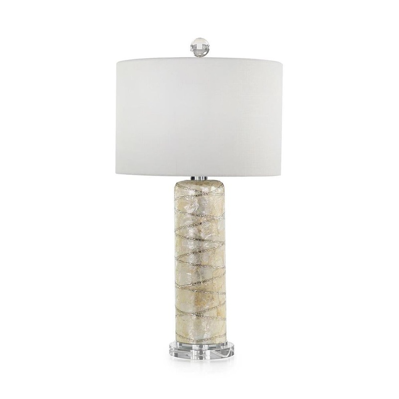 Capiz Spiral Table Lamp is a stunning contemporary design showcasing natural materials. A rounded body of pure capiz shell and linen fabric is adorned in textural silver spirals. The piece features Polished Nickel hardware with a matching ball finial, and gently rests atop a clear crystal base. The look is completed by a round white linen shade with rolled edges.