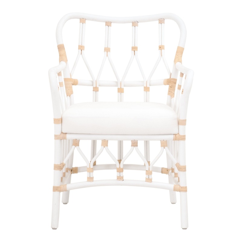 This tropical-inspired arm chair will add an exotic flare to your dining room or kitchen. It is constructed with natural rattan that is hand-shaped and beautifully curved for a versatile design. The rattan pole is painted with a white finish and includes natural rattan binding wrapped along the joints of the chair. It also features a white upholstered seat that blends nicely with the white frame. The color palette of this chair is light and neutral, making it easy to fit in with many color schemes. This arm chair will work well in a sunroom, nook or any bohemian, tropical or coastal designed room.