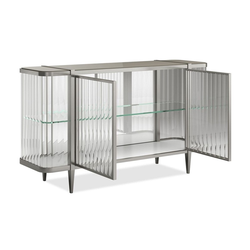 It’s true, this console is so extraordinary, you can’t help but Stop And Stare. It’s an instant source of brightness and reflectivity that creates a natural focal point. A wavy acrylic exterior mirrors the undulating patterns of sand and sea while its top adds another layer of organic splendor. The mirrored interior back and bottom panels are designed to reflect light as it pours in from every angle as well as mirror the beauty of the treasures you display. Glass shelves ensure unobstructed views as do its touch-latch doors with concealed hinges. A Lightly Brushed Chrome finish outlines its rounded silhouette and four tapered feet, imparting the overall luxe feeling of a diamond in a platinum setting.