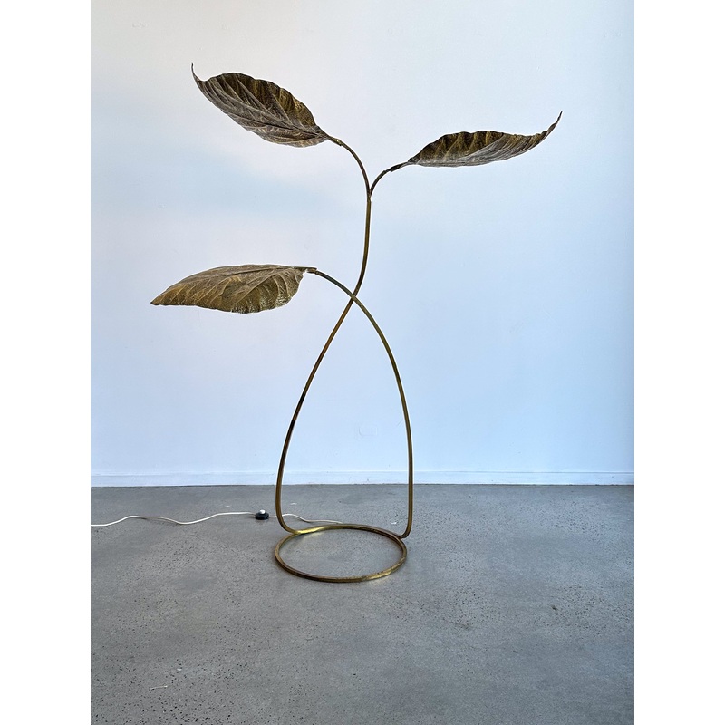 Huge and elegant three-leaf brass ‘Rabarbaro’ or rhubarb leaf floor lamp with embossed leaves, handmade using repouss and chasing techniques, mounted on stems ending on circular base, Italy, 1970s.