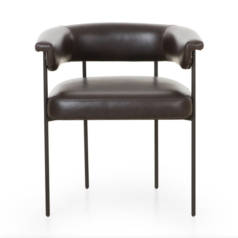 Airy and light with slim, black-finished iron framing, black top-grain leather exclusive to Four Hands lends texture to a beautifully sculpted dining style featuring a yoke back and exterior fold detailing.