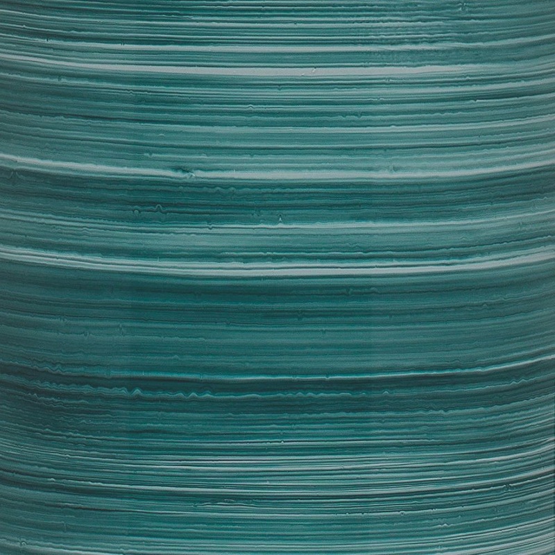 Striated layers of swirling glass, from marine blues to pale sky blues. Artisan mouth blown and crafted on a metal base.