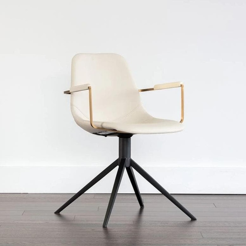 This swivel dining chair is where urban cool meets contemporary elegance. Stocked in dillon cream faux leather. Brushed gold finished arms and black iron legs complete this look. Also available in abbington black fabric with contrasting bravo black faux leather and slate tint fabric with contrasting nightfall black faux leather. Handle With Care: This design has been crafted with faux leather. Faux leather is manufactured to reflect the natural characteristics of leather; as such, colour variations, markings wrinkles, grooves, and light scratches are appreciated characteristics. No two pieces will be alike. Visit our Product Care page for more information on how to ensure the lasting beauty of this piece.