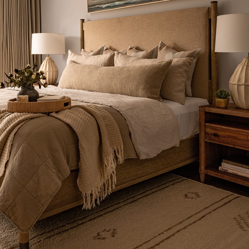The Castine Bed has softly rounded forms combined with the sand-blasted greige finish. The wire-brushed gray/beige on quartered white oak gives the footboard some textural detail and the headboard features linen fabric.