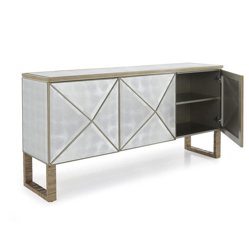 The Katrina Credenza is a stunning contemporary piece with a wealth of dimensional depth. Crafted from beech wood, the square frame has been overlain with eglomise panels, including beveled panels on the front side. Opulent borders in Valyrian Gold neatly trace the edges of the piece, matching two textural steel U-legs. Three push-latch doors display an angular look and feature a Champagne Silver finish. The three interior compartments each feature a single adjustable shelf.