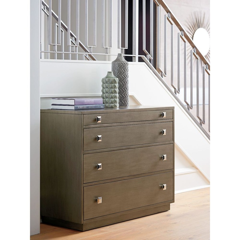 Marketing Copy: Ariana offers a high-fashion take on modern luxe living, blending a hand-glazed platinum finish with sophisticated accents like burnished silver leaf, platinum-finished stainless steel, elegant silver gray drawer interiors and polished silver marble with veining in shades of taupe and gray. Designs feature classic lines, with elements like raised panel doors, tapered legs and hand striping. Custom upholstery styles showcase fresh color palettes and tailoring details like decorative tapes and beaded fringe. The result is a lifestyle aesthetic that celebrates a chic, sophisticated interpretation of today’s contemporary design.