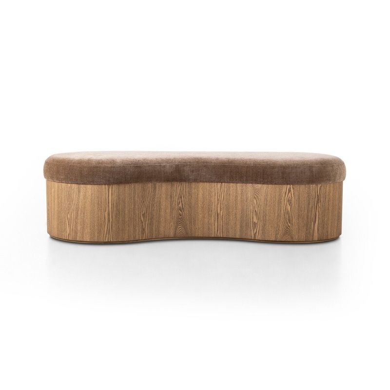 Elevate any room with a curvy statement bench. Made from a kidney-shaped base of toasted ash veneer and a soft, velvety seat.