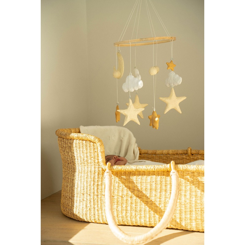 Indulge in sweet dreams with the Celestial Cotton Mache Mobile. As if looking up to the sky, clouds, moons, and stars float above the crib creating a soothing atmosphere to lull your little one into a peaceful slumber. This mobile serves as charming decor for both stylish nurseries and boho-inspired baby rooms.