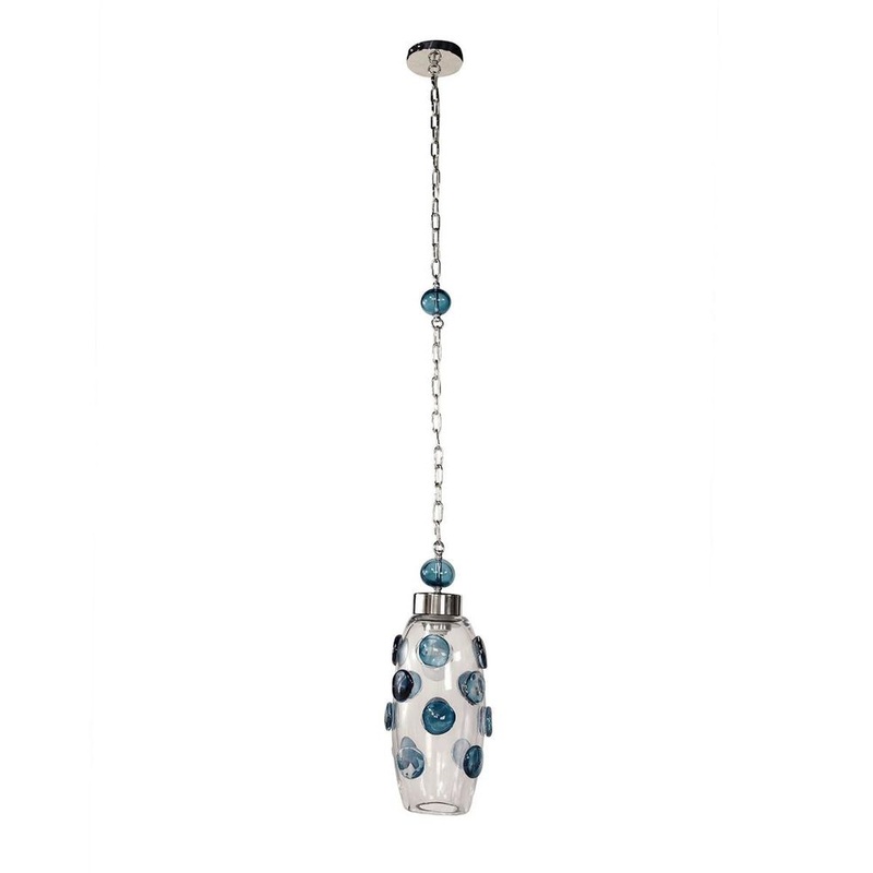 The Azure Spots Pendant is a gorgeous decorative light source showcasing a playful personality and a wealth of visual depth. Crafted from mouth blown glass, the piece showcases a clear cylindrical body that is adorned with a variety of dimensional cerulean spots protruding from the surface. The piece features a stainless-steel accent at the top, as well as two glass orbs accenting the steel chain.