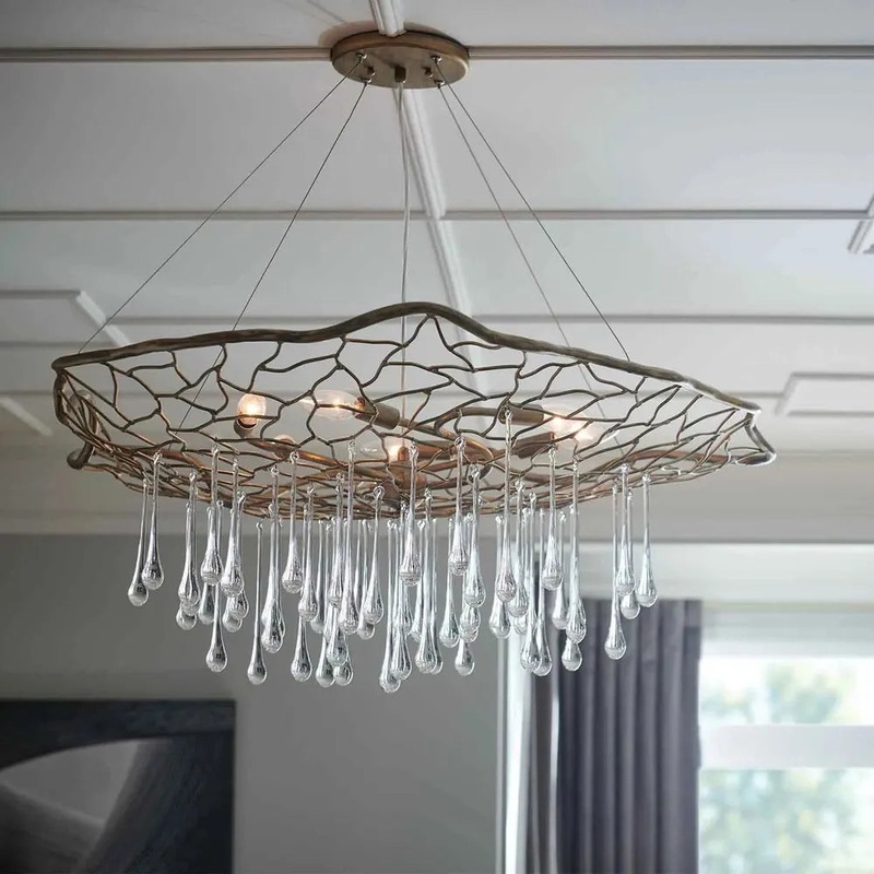 Imagine a net gently breaking the surface, then slowly emerging with a cascade of water droplets trickling through and shimmering with light. Laguna uses a hand-made open framework design in Brushed Gold as the foundation in this artistic interpretation. Clear glass droplets fall at varying lengths, casting the light. Minimal hanging wires ensure the net itself appears to float, as a candle cluster emits light from within. Laguna is part of the Lisa McDennon Collection.