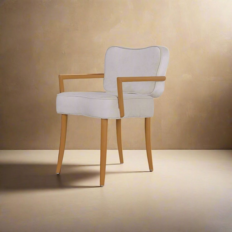 This stylish dining chair is inspired by the striking mid-century designs of the 1940’s, and will look stunning in modern and contemporary style spaces alike. A slender but sturdy teak wood frame provides support for the fully upholstered cushioned seat and back. The eye catching curves of the back give this piece its unique flair. Pair with the matching side chair for a complete dining set.