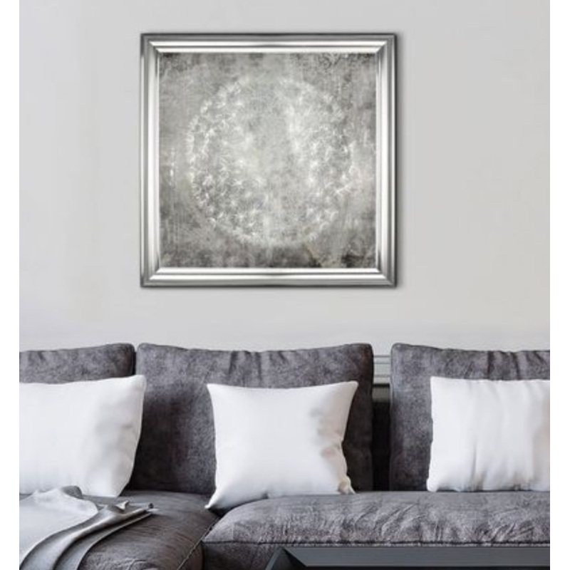 If one dandelion clock is bewitching, then three are a Charm. Carol Kavanagh’s dandelion globes languish over the subtlest suggestion of foliage and bracken, on metallic canvas. Slivers of silver radiate from the globes like frosty haloes, in a magical image of ineffable delicacy and beauty. Demurely glamorous in its statement square silver frame.